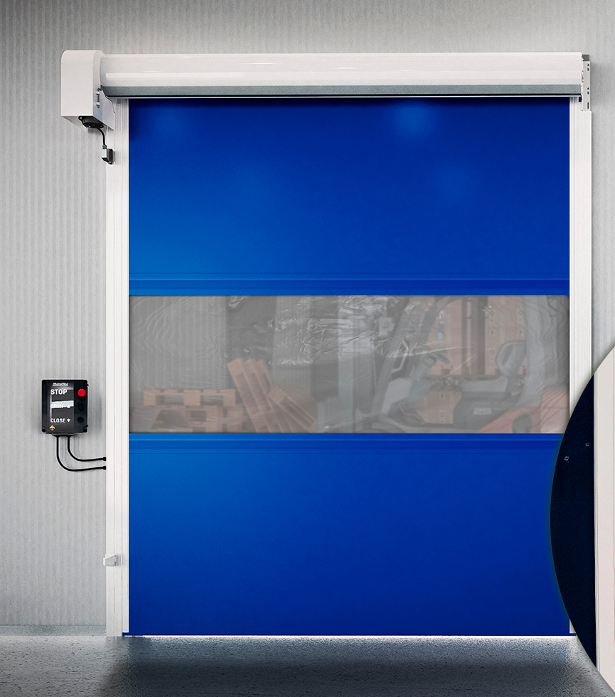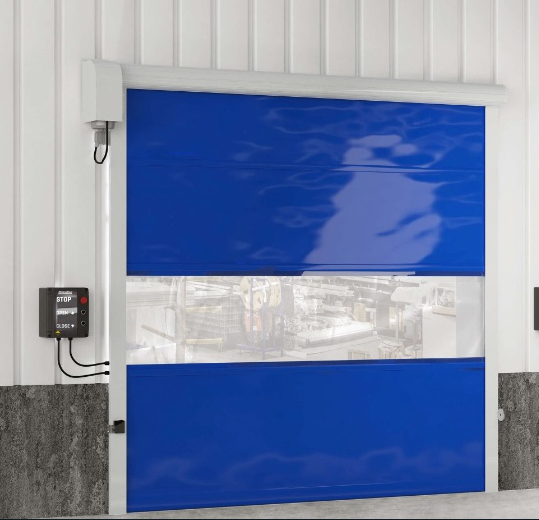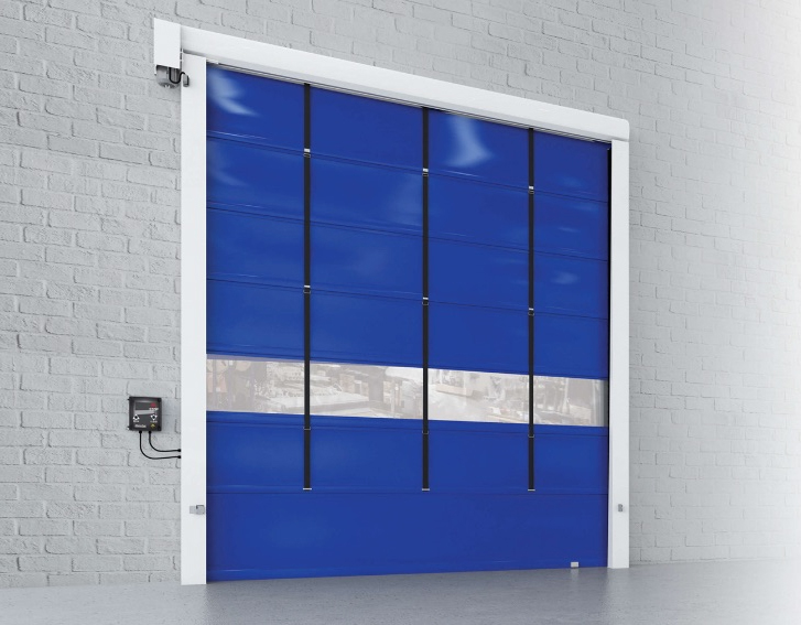 Puerta rápida para uso intensivo, que se autorrepara cuando la lona se desplaza de las guías. Adecuada para zonas de alta presión de aire.
